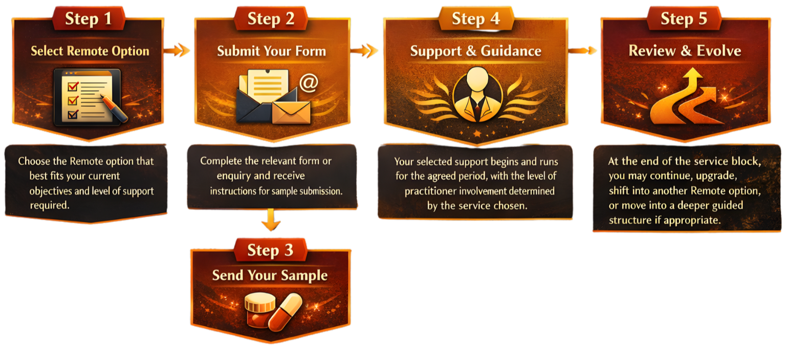 Rather than functioning as a standalone Remote product only, REMOTE PRIME combines intake, TeleConsults, Remote Services, review structure, and progression through the Access Tiers. It is designed for those seeking a more guided remote journey with deeper continuity and a clearer long-range framework.